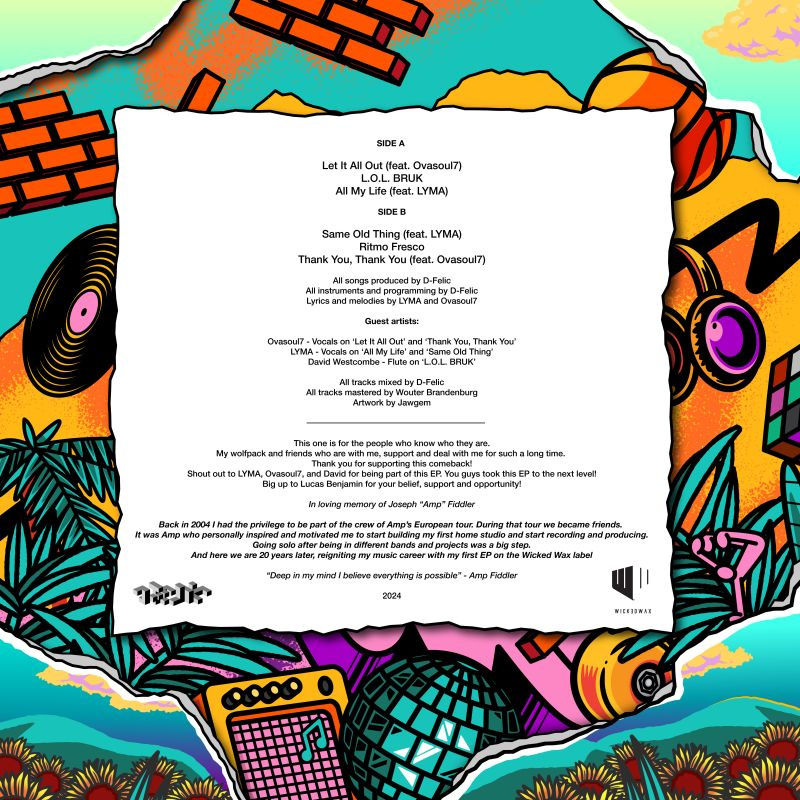 The official return of Dutch producer D-Felic. In the early 2000s he was one of the few in the Netherlands who got into the broken beat/soulful house sound, next to also crafting neo-soul, hip-hop and funk-oriented productions. He has worked with people like Colonel Red, Takuya Kuroda, Sandra St. Victor, Mark de Clive-Lowe, & others. After having dropped various remixes in the past year, and a few singles from the vault, it's now finally time for his comeback EP and vinyl debut: 'rEVOLution'. The EP features six soulful tracks, two with Dutch vocalist LYMA, two with US vocalist Ovasoul7 and two instrumental cuts. The unique and colorful album artwork is done by Jawgem, a fellow artist from The Hague.