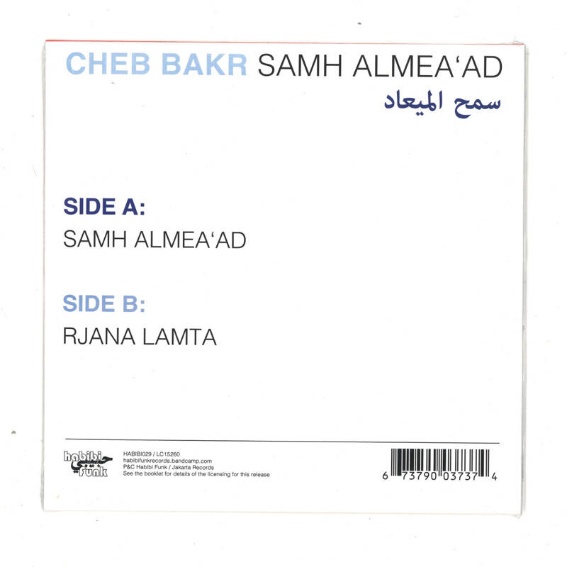 This 45 marks the beginning of our work with Cheb Bakr, offering a glimpse into his unique musical style, with a full album to follow at a later date. The release includes two standout tracks that showcase Bakr’s dynamic range. Side A features “Samh Almea'ad,” a reinterpretation of a 2003 New York classic with Bakr’s signature spin. Since our first listen in that Cairo hotel room, it’s been played at every Habibi Funk set without exception. Side B, produced by Ahmed Ben Ali, features “Rjana Lamta,” a track that hints at American influences alongside a nod to Ahmed’s “Dameek Majeb.” Bakr’s artistry ties these contrasting elements into an original, dancefloor-ready track that remains as captivating today as it was two decades ago. As always, this 7" release comes with a booklet detailing some of the Cheb Bakr story. Samh Almea'ad will be out on vinyl December 6th.
