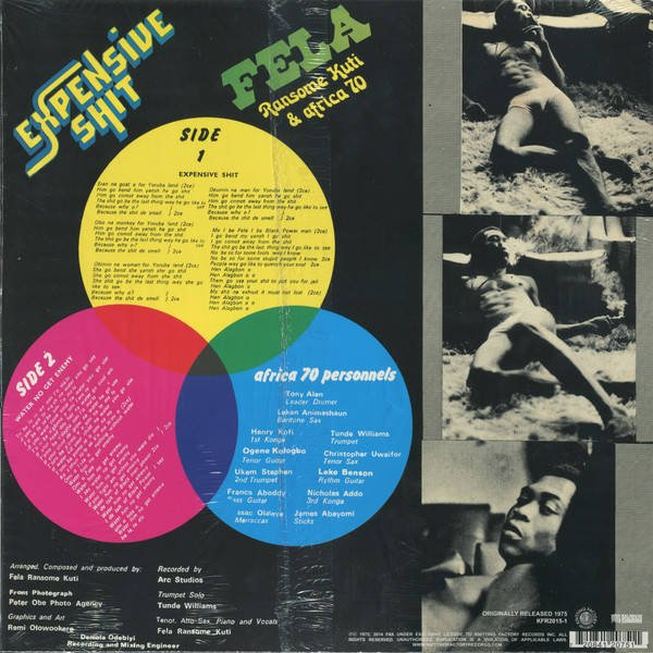 Destination Nigeria, 1975, Fela and Africa 70 are indelibly locked into a hugely prolific groove with well over 10 albums behind them. Then they release this, an LP comprised solely of two wondrously extended work outs from the troupe. "Expensive Shit" famously tells the tale of Fela's brush with the jaded law while "Water No Get Enemy" speaks - or rather sings - for itself.