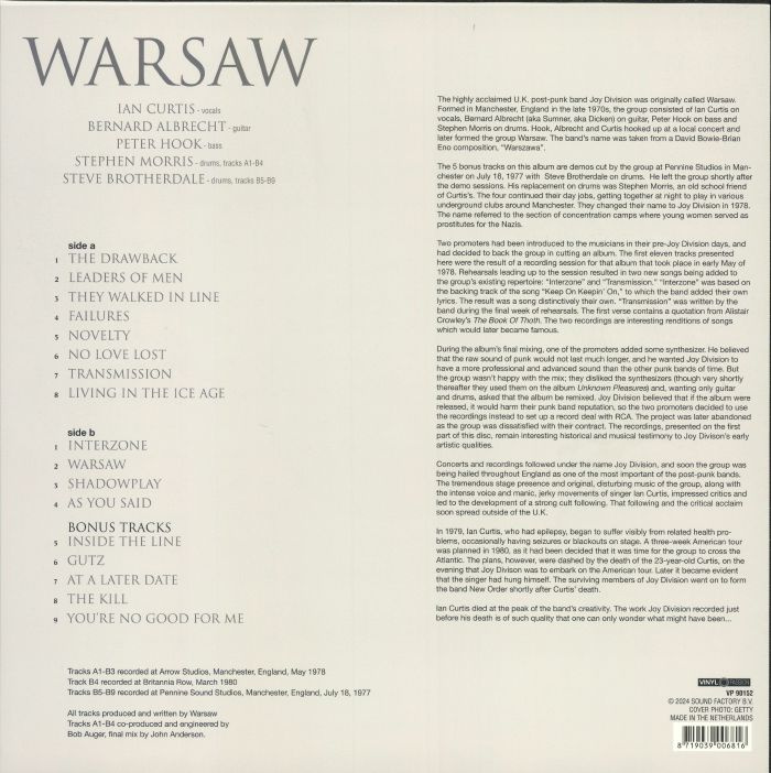 The highly acclaimed U.K. post-punk band Joy Division was originally called Warsaw. Formed in Manchester, England in the late 1970s, the group consisted of Ian Curtis on vocals, Bernard Albrecht (aka Sumner, aka Dicken) on guitar, Peter Hook on bass and Stephen Morris on drums. Hook, Albrecht and Curtis hooked up at a local concert and later formed the group Warsaw. The band’s name was taken from a David Bowie-Brian Eno composition, “Warszawa”. The 5 bonus tracks on this album are demos cut by the group at Pennine Studios in Manchester on July 18, 1977 with Steve Brotherdale on drums. The first eleven tracks presented here were the result of a recording session for that album that took place in early May of1978. Rehearsals leading up to the session resulted in two new songs being added to the group’s existing repertoire: “Interzone” and “Transmission.” “Interzone” was based on the backing track of the song “Keep On Keepin’ On,” to which the band added their own lyrics. The result was a song distinctively their own. “Transmission” was written by the band during the final week of rehearsals. The first verse contains a quotation from Alistair Crowley’s The Book Of Thoth. The two recordings are interesting renditions of songs which would later became famous.