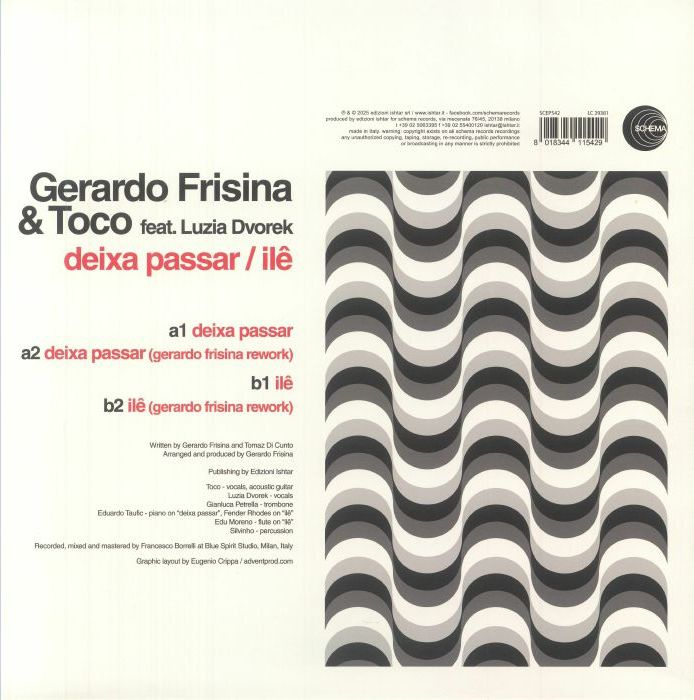 Introduced by the digital single ‘Deixa Passar’, this 12” EP concretises on physical support the renewed collaboration between the two Schema Records artists Gerardo Frisina and Tomaz ”Toco” Di Cunto, working together again five years after the release of the EP “Frisina Meets Toco” (SCEP 487): the two unreleased songs here included, the aforementioned “Deixa Passar” and “Ilê”, are featured both in their original and reworked versions, and represent an excellent blend of samba jazz and Brazilian popular music. In both tracks, the music composed and arranged by Gerardo backs up the Portuguese language lyrics and melodic lines of Toco, who duets with Luzia Dvorek in an almost surprising contrast between serious and graceful sounds. The instrumental department features Gianluca Petrella on trombone, Eduardo Taufic on piano (Deixa Passar) and Fender Rhodes (Ilê), and Edu Moreno on flute (Ilê), in an excellent ‘union of opposites’, between popular music and modern sounds, between acoustic instruments and electronics, with mystical influences that envelop the songs with a mysterious and attractive aura. Not only musically, but also visually and lyrically, this EP is a tribute to the Brazilian culture and lands, already from a cover that re-imagines the iconic shapes of the famous Copacabana pavement in Rio De Janeiro: while “Deixa Passar” celebrates Rio’s carnival as an opportunity to momentarily free oneself from the burdens of life, “Ilê” recalls the traditions of Salvador De Bahia’s historic ‘bloco afro’ quarter called Ilê Aiyê.