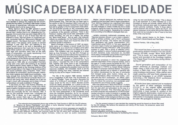 What happened at the Institute was a systematization of António's self-taught practice. Computer software, Musique Concrète, noise and silence, organisation of abstract ideas and sounds. The original notes on the back sleeve of the LP give some indication of process and thinking, but a more detailed account was given by António in the liner notes of the CD reissue in 2002, which are also included in this 2025 LP reissue.