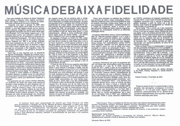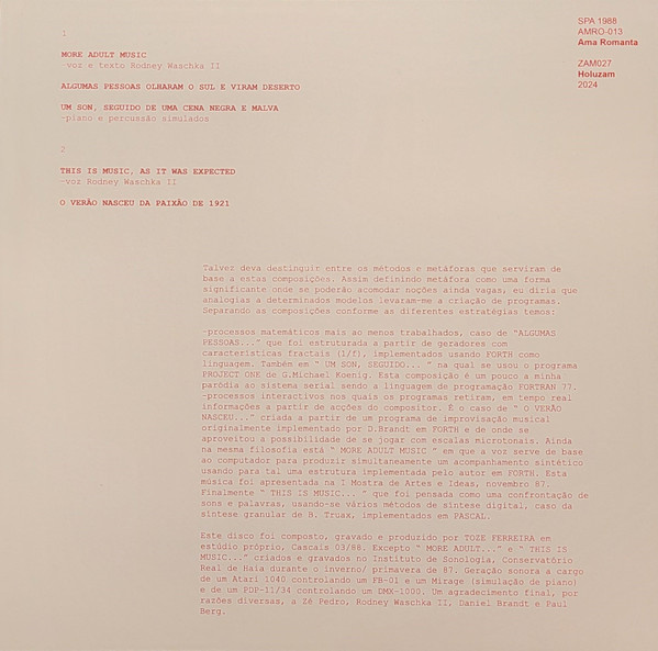Ferreira recalls an exciting learning process added to his experiments with Canavarro's array of synths such as the Korg Ms 20, Korg polysix, ARP Axxe, Roland SH-01, the Ensoniq Mirage sampler... He read in a magazine article about someone who had studied at the Institute of Sonology (then in Utrecht, Netherlands) and went there during a vacation trip in the Summer of 1983. He became excited by the prospect of studying at the Institute but money was a problem. Canavarro, on the other hand, was admitted there in the following year. Back in Portugal, Ferreira eventually abandoned his Chemical Engineering studies in Lisbon's Technical Institute in favour of a more focused music practice. He collaborated with Telectu during 1984 and 85 as a sort of technical engineer, implementing some recording solutions and background tapes and went to work at a thermoelectric power plant in Sines, hoping to make enough money to fund his musical studies. He did and proceeded with the paperwork for admission at the Institute of Sonology, now based in The Hague. António studied there in 1986-87 and the present album includes two compositions developed at the Institute: "More Adult Music" and "This Is Music, As It Was Expected", both featuring the voice of Rodney Waschka II. Among other activities and talents, Rodney is an expert in computer music and to António his voice sounded similar to Robert Ashley's, whose work he admired.