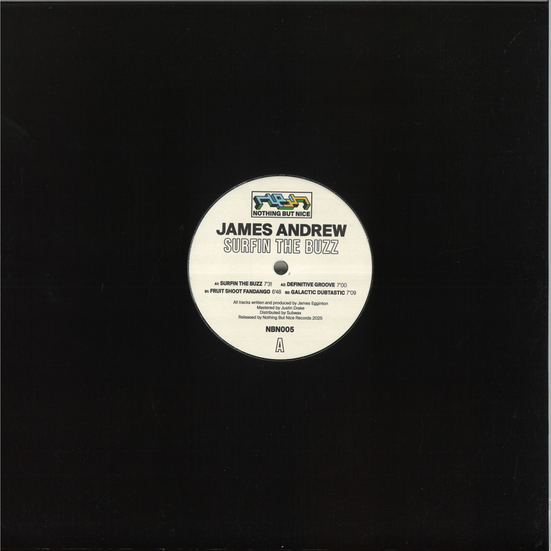 The fifth slice of wax from Nothing But Nice's 12"s series comes from James Andrew. His new one consequents 2020's 'Thinking Backwards' EP, which established Andrew as both a sonic and titular rib-tickler, with titles like 'Stereomaster 3000' and 'Billy & The Clonosaurus' indicating a fantastic imagination and a complementary jocosity. 'Surfin The Buzz', however, gets relatively serious, at least on the A side. Not pure jovials, this title track and its counterpart 'Definitive Groove' serve wave-riding sureties with a garage house feel. Laser-guided descents and "I wanna" samples fetishise the groove much further; we cannot simply laugh them off. Only the B-side lifts the veil, with 'Fruit Shoot Fandango' and 'Galactic Dubtastic' connoting confectionary E-numbers and sour tannins, though the sound is equally as accomplished: the B2 especially recalls the amazing psycho-dub of Children Of The Bong or Tradition.