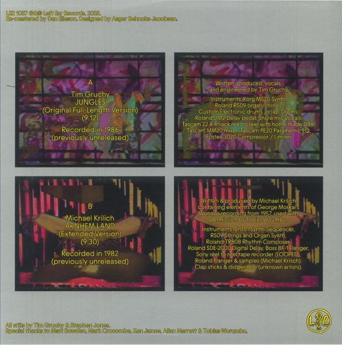 Side A: Features an unreleased full-length version of Tim Gruchy’s Jungles, a solo electro-percussive piece recorded in Tim’s Lab D’Avoid studio in Brisbane. The track is emblematic of his style during an era when he worked extensively in music, both as a percussionist and primarily with electronics, including early analog synths.