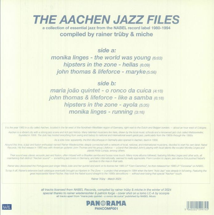 Aachen Jazz Files is a tribute to NABEL Records, a groundbreaking German jazz label active from 1980 to 1994. This new and essential compilation has been curated by Miche and Rainer Truby and highlights NABEL's unique fusion of acoustic jazz, Brazilian rhythms and avant-garde influences. Featuring gems like Monika Linges Quartet's samba-infused grooves, John Thomas & Lifeforce's cosmic explorations and Maria Joao's expressive vocals, this collection captures Aachen's rich jazz heritage from every angle. Though it was once a hidden gem, NABEL's sound has since travelled worldwide and its sophistication and warmth shine through here from a most distinctive era of jazz.