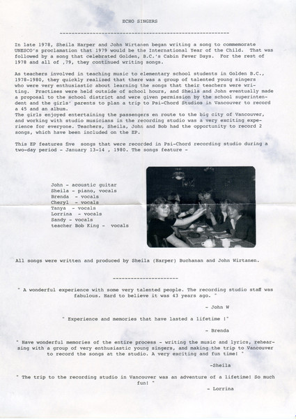 Real special folky 7"... An official collection of otherworldly and beautiful folk songs performed in 1980 in Canada by pupils (singers) and their teachers (instruments). Three songs are taken from a scarce privately pressed 'mysterious' Lp released under a different moniker. Two songs are unreleased songs from that session in 1980.