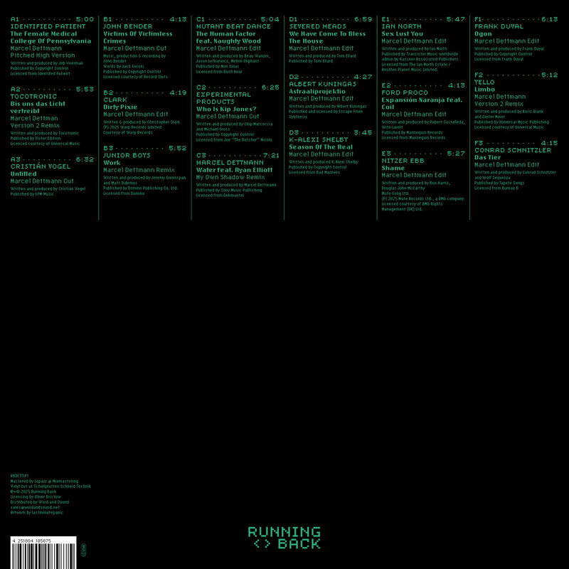 Marcel Dettmann brings three decades of DJing nous to Running Back's Mastermix series, curating a 3xLP compilation of long-time secret weapons and prized edits, many afore unreleased. Not to tune into the legacy of a single club as earlier Mastermix volumes have done, Dettmann turns the focus inward, drawing on his personal archive of tailored tweaks and floor-tested reworks. Raised in the former GDR and immersed in Berlin's post-unification underground, his early grounding in post-punk and industrial music still echoes throughout these selections, ranging from Cristian Vogel's 'Untitled' (1995) to fresh flips of Yello, Nitzer Ebb and K-Alexi Shelby. Also included are edits of Experimental Products, Severed Heads and Ian North, plus a closing pass at Conrad Schnitzler's 'Das Tier' that threads everything back to Berlin's anarchic, bank vault-raiding sensibility.