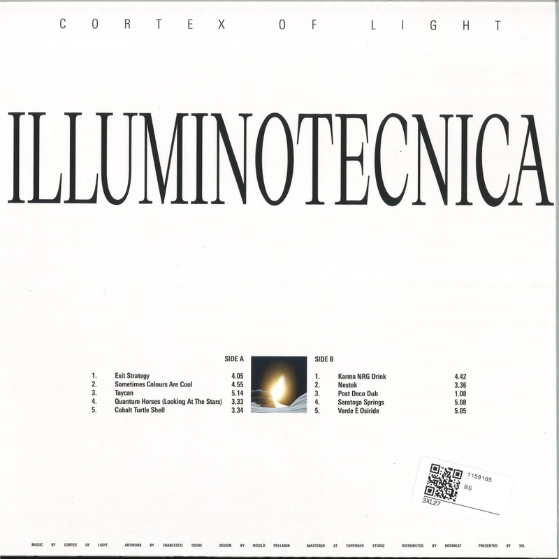 3XL’s first new release in 2025 by Italian trio Cortex of Light is a synapse-tickling dose of classic FSOL-era world-building that takes in gloopy trance cooked down with sub-heavy, vaporous dub, mutant acid, breakbeat rave, Artificial Intelligence and a Mark Fell-style algorithmic brainmelt. You'll know if you've spent any time following Piezo's output that the Milan-based producer and Ansia boss has a knack for lysergically enhancing any club template he sets his sights on. With releases on Idle Hands, Wisdom Teeth, Loefah's 81 and most recently Dekmantel, Luca Mucci has blottered up dubstep, hard drum, 2-step and minimal techno, here re-convening with fellow Milanese journeymen Aitch and primordial OOze/xàr num as Cortex of Light to blur those edges even further 'ILLUMINOTECNICA' isn't the trio's first release, but it's their most substantial and easily most developed. If 2024's 'Aeon Is A Child At Play With Colored Balls' showed off their aptitude for threading their luminous soundscapes into a horizontal soundtrack, then this album is a proper chance for Cortex of Light to show off their versatility in a different setting, matching dancefloor hallucinations with expertly sculpted sound design. Psilocybin-tainted soundscapes scrape into breathy flute sounds and chest-thumping bass drops on the opener, haunted by a vision of electronic music that's been contrived in back rooms, squats and outdoor raves for decades at this point. Like so much of the rest of the 3XL catalog, there's a drive and coherence here that comes from classic dub techno and chill-out room fodder (think The Black Dog or Pentatonik), but always infused with something that dates it to the present era, be it a tactile sliver of Visible Cloaks-style neo-new age ambience, or a sort of mescaline-dipped take on Photek's bass-heavy, meticulously hazed 'Solaris' period downtempo gear, chopped 'n screwed into the uncanny.