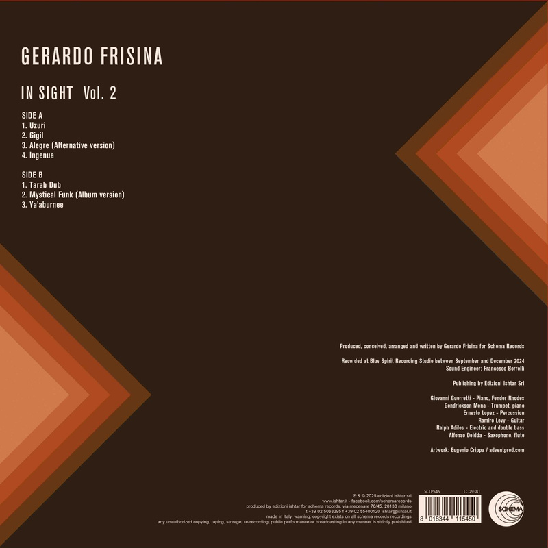 Firmly bound to Schema Records since the beginning (“Ad Lib”, 2001), in over twenty years of career Gerardo Frisina has released several records that have consolidated his status as a leading name in the international jazz and electronic music scene. Always unique in blending traditional elements (latin jazz, funk, soul) with modern sounds, since “Moving Ahead” (2020) in particular Gerardo has introduced new ‘cosmic’ and ‘futuristic’ elements into his style, in a constant evolution that culminates today with “In Sight”: this new double work, conceived and produced in two separate volumes - the second one available from May 23rd, 2025 - further refines a sound that can be clearly recognized from the first notes of each track. “In Sight Vol. 2” is first and foremost characterised by four new compositions, more structured than in the past, with a distinct psychedelic and minimal- dance vein that makes them more expansive and thoughtful; among them all, “Ya’aburnee” stands out, thanks to influences ranging from Four Tet to Trentemøller. There’s no shortage of more ‘club-oriented’ episodes too, thanks to the new arrangements of “Mindoro”, “Tarab” and “Mystical Funk”, the latter already released on 45rpm and here expanded into an ‘Extended Version’ by Fender Rhodes and electric guitar solos, perfectly closing one of Gerardo Frisina’s most complete and eclectic productions ever!