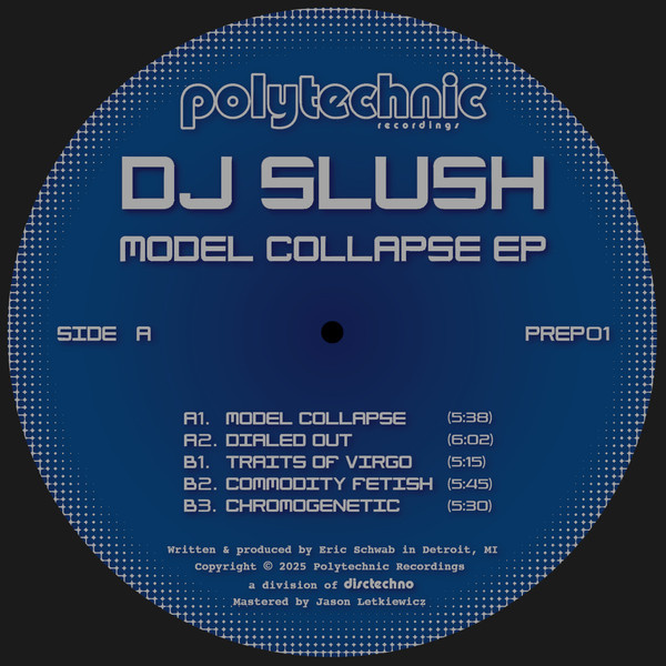 Detroit’s DJ Slush presents his debut solo EP “Model Collapse” with five versatile tracks inspired by classic stripped down Midwest house & techno. The EP marks the launch of Polytechnic Recordings - a new sub-label of Mark Grusane’s Disctechno Music - run by Eric Schwab (DJ Slush) & Grusane. Following his productions on the Midwest Rhythms series, “Model Collapse” delivers more jacking drum machine programming, spacey & melodic synth lines, and a few psychedelic elements, with nods to the early years of deep house & proto-techno, packaged in a full color jacket sleeve.