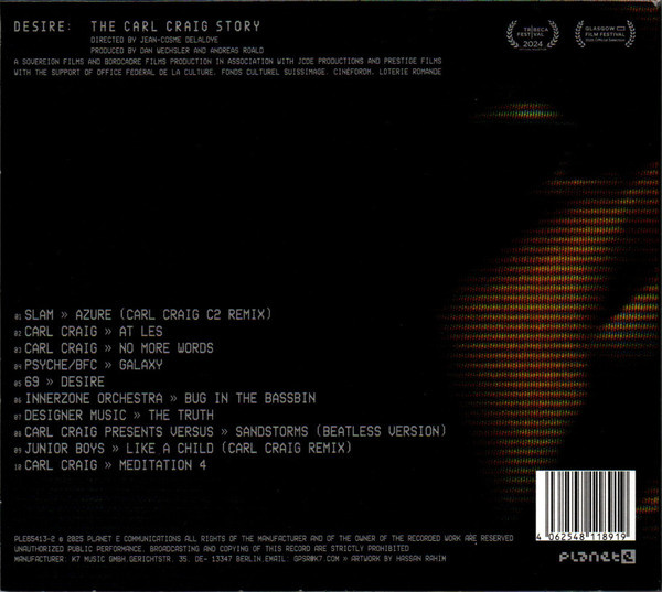 Oficjalna ścieżka dźwiękowa do filmu dokumentalnego Jeana-Cosme Delaloye'a o życiu i karierze pioniera techno z Detroit, Carla Craiga, „Desire: The Carl Craig Story”. Kompilacja wydana przez jego wpływowe wydawnictwo Planet E Communications zawiera muzykę z obszernego katalogu Craiga, w tym kilka utworów, które nigdy wcześniej nie doczekały się pełnej wersji cyfrowej. Wśród utworów znalazły się liczne pseudonimy i projekty artysty, oferujące rzadki wgląd w pełen zakres jego przełomowej kariery. Wśród rzadkich i zremasterowanych utworów znajduje się "No More Words" - pierwotnie wydany w 1991 r., teraz ponownie na winylu i po raz pierwszy w wersji cyfrowej. "No More Words" to fundamentalny utwór w kanonie techno z Detroit, oddający emocjonalne dźwięki syntezatorów i dynamiczne rytmy brzmienia Craiga, które wkrótce miały rozbrzmiewać na parkietach tanecznych na całym świecie. Jej reedycja stanowi moment refleksji nad korzeniami i ewolucją gatunku. Kolejnym zremasterowanym utworem z obszernego archiwum Craiga jest "The Truth", głęboki utwór z dyskografii Craiga wydany pod pseudonimem Designer Music - teraz dostępny po raz pierwszy ćwierć wieku od pierwotnej premiery. W napisach końcowych filmu wykorzystano ścieżkę dźwiękową z kontemplacyjnego utworu "Meditation 4", produkcji ambient, która wcześniej była dostępna jedynie na składance Craiga Masterpiece z 2013 r. wydanej przez Ministry of Sound. W filmie znalazły się kultowe remiksy, takie jak nominowana do nagrody Grammy przeróbka utworu" Like A Child" zespołu Junior Boys czy wzniosły miks utworu "Azure" zespołu Slam z 2012 r., który został wykorzystany w czołówce filmu i wcześniej był dostępny tylko w limitowanej edycji. W różnych formatach ścieżki dźwiękowej pojawiają się także kultowe produkcje Carla Craiga wydane pod pseudonimami 69, Psyche/BFC i Innerzone Orchestra, a także kolaboracje z Moritzem von Oswaldem i Francesco Tristano. Ścieżka dźwiękowa stanowi dodatek do nowego filmu dokumentalnego wyreżyserowanego przez Jeana-Cosme Delaloye'a i wyprodukowanego przez Sovereign Films, który przedstawia podróż Carla od korzeni Detroit jako miasta klasy średniej do światowej sławy, rozgrywającą się na tle upadku i odbudowy miasta. Film przedstawia jego twórczość na styku muzyki, sztuki i kultury, od współpracy z Bottega Veneta po instalację Party/After-Party, zakupioną przez Detroit Institute of Arts i wystawioną w MOCA Los Angeles. W filmie Desire znalazły się wywiady z Gillesem Petersonem, Roni Size, Laurentem Garnierem, DJ Minxem, Kennym Larkinem, Moritzem von Oswaldem i Jamesem Lavellem. Przedstawiono w nim również zaangażowanie Carla na rzecz artystycznej działalności czarnoskórej ludności Detroit i często pomijane afroamerykańskie korzenie muzyki elektronicznej.
