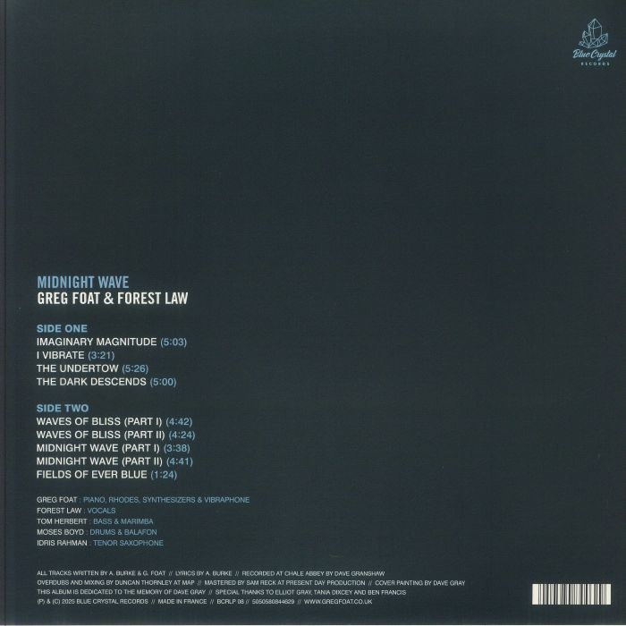 Greg Foat and Forest Law (Brownwood, Bongo Joe) collaborate on an epic concept album about Life, Death, painting and Surfing. Inspired by the art and life of a local Isle of Wight artist and surfing legend Dave Gray. The album philosophically chronicles the many aspects of surfing and surf communities. This is the first album by Greg Foat to feature vocals throughout. Forest Law's lyrics are evocative and ethereal. Reminiscent of David Sylvian and Early Peter Gabriel. The Album features Moses Boyd - drums, Idris Rahman - Tenor Saxophone, Tom Herbert - Bass, Greg Foat - Grand Piano, Fender Rhodes and Synthesisers, Forest Law - Vocals