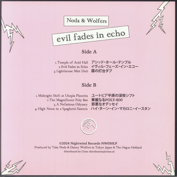 Takafumi Noda aka Mystica Tribe and Legowelt with their second Noda & Wolfers album on Nightwind Records Once more, Japanese digital dub legend Takafumi Noda, aka Mystica Tribe, and Dutch synth wizard Danny Wolfers aka Legowelt reunite for their highly anticipated second album under the Noda & Wolfers project on Nightwind Records. EVIL FADES IN ECHO offers a unique concoction of digital dub, raw lo-fi electro and acid hall influences, creating a deviant captivating sound. Wild untamed synths clash with raw sloppy rhythm boxes. Seductive spring reverbs dissolve into clouds of space echo. Heavy intense bass crumbles on decaying fuzzy tapes while Noda's haunting melodica melodies elevate this LP to new heights!