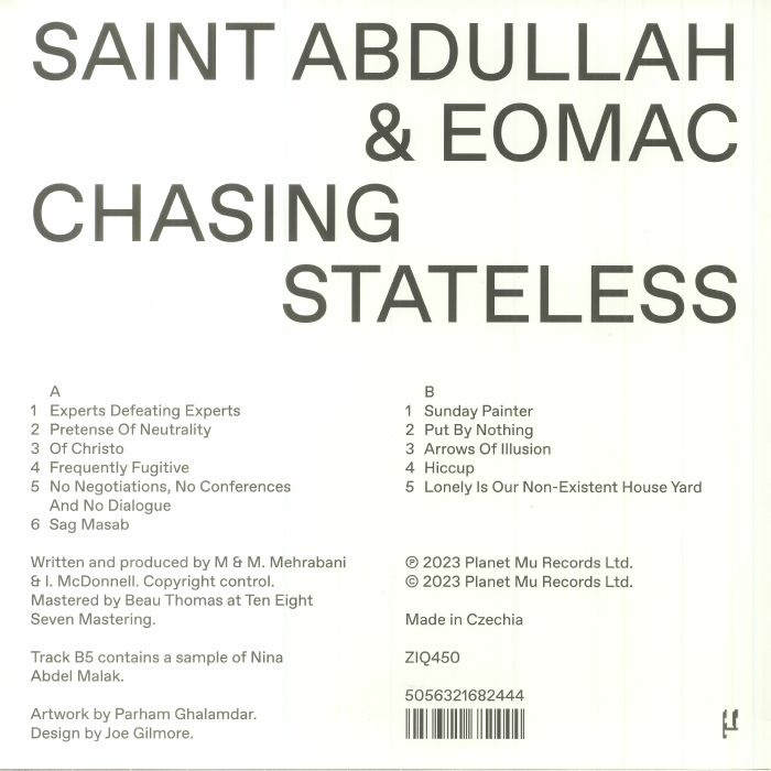 Musically, the album approaches established genres and re-orientates them towards middle eastern rhythm and melody with an iron soul. Songs are rough and intense. Rusty polyrhythms, daf drums wrapped in a thick coating of distortion or punchy kicks with micro-edited samples of middle eastern life spiralling across them. Mournful melodies are squeezed out until the music teeters on the edge of rhythmic collapse. 'Chasing Stateless' is rough and energetic but also tender and reflective too. It's a human sound, utilising technology but not about technology. Sample heavy with expressions of anger, sadness and hope present and deeply felt.
