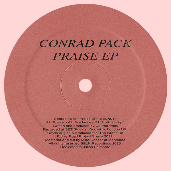 "Conrad Pack returns to SELN Recordings with a three track EP threading the needle between London sonics and something beyond. The primary tracks Praise and Guidance were recorded during the height of the Scram events organised by Leeway (Guy Gormley), and hosted by the late soundsystem luminary Julian Fairshare at Ormside Projects. The influence of this period, and in particular of Fairshare himself, on the music is clear; both are stepper-esq, leaning heavily on London’s musical legacy past and present, whilst still pushing a contemporary sound. Praise is essentially a Dub track. The percussion and bass are of a familiar steppers nature, with the synths evoking a true Big Smoke feeling. Although the melody itself wouldn’t sound out of place in a UK Drill number, the song overall still touches on Industrial and DIY sonics, being all the stronger for doing so. Guidance follows in solid form. Amongst the driving percussion and staunch bassline, droning pads lock in a dense mood whilst sparse choral melodies echo throughout. Think Shaka meets Muslimgauze, but recorded in a Woolwich Office Block. Grotto was originally produced for the group show “The Grotto” held in January 2021 at Ridley Road Project Space. Restructuring the track from the original stems, Pack presents a new and enchanted “stereo version” for Praise EP. Angelic atmospheres flow amongst scattered hi-hats as sporadic Freetekno Kicks reverberate across the void. Most accurately described as “what Curley in a K Hole might have sounded like”."
