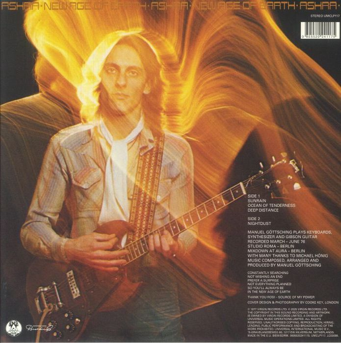 Berlin guitarist and synth explorer Manuel Gottsching dissolved Ash Ra Tempel in 1975 and reemerged as Ashra, steering into an electronic cosmos that moved away from the acid-soaked space rock of his earlier group. Recorded over spring 1976, New Age Of Earth distilled the kosmische sound into four long-form pieces, blurring minimal repetition and astral drift. 'Sunrain' bubbles with proto-techno insistence, 'Ocean Of Tenderness' bathes in aquatic pulses and natural sound effects, 'Deep Distance' folds surf guitar inflections into icy electronics, while the 21-minute 'Nightdust' unfurls with tenebrious patience, climaxing in Gottsching's soaring electric guitar. First released in 1976 on Isadora, then reissued on Virgin the following year, the album became a touchstone for electronic and ambient music.