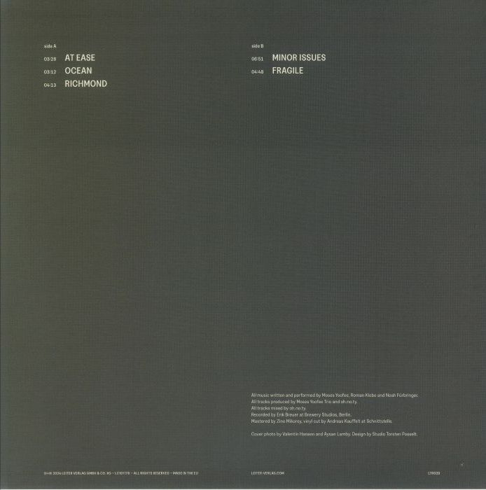 The trio - pianist/keyboardist/producer Moses Yoofee, bassist Roman Klobe-Baranga, and drummer Noah Fürbringer -has made a name for themselves in recent years with spectacular live shows in clubs in Germany and beyond. Influenced by R&B, hip-hop, and soul as well as more traditional jazz, Ocean's songs reflect the spontaneity, inspiration, and instinctive sophistication of their live performances. The gloriously hectic title track and the increasingly ecstatic Minor Issues contrast with the more restrained complexity of At Ease - and while the hypnotic rhythm of Fragile betrays their love of hip-hop, the lush Richmond is propelled by a gloriously serene groove before shifting into high gear at its climax. "Everyone loves fusion," say the band, "even if no one admits it," but that's just one element of the trio's sophisticated style, where Moses' exceptional keyboard skills meet Roman's flowing bass lines and Noah's tight drum patterns.