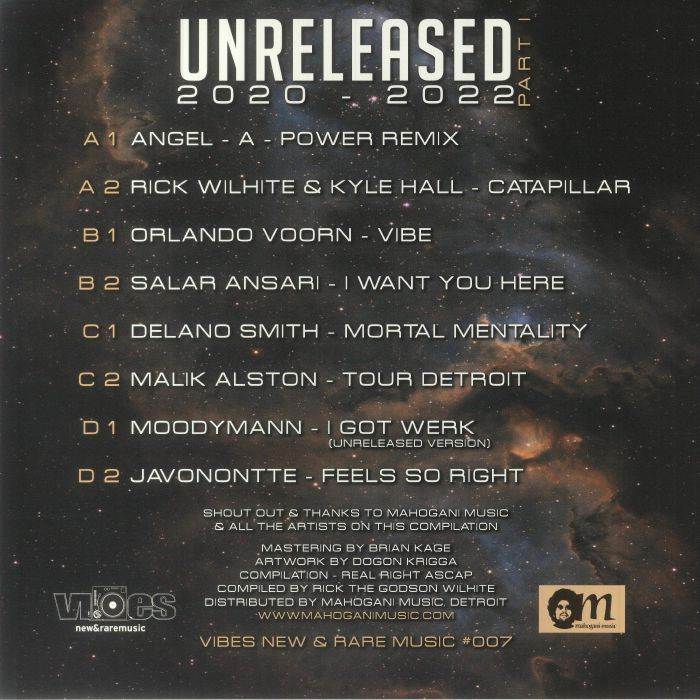 Moodymann's Mahogani Music backs this fresh compilation put together by Rick "The Godson" Wilhite - US house and techno DJ, remixer, producer, and longtime fixture of the Detroit techno circuit. Having sat behind the founding counter at The House of Music record store in downtown Detroit for years, we've no doubt in Wilhite's curatorial chops nor his productions; Unreleased 2020-2022 Vol. 1 is the first in a series that collects work by himself and others in his orbit, laying down a pivotal smorgasbord of only the legittest mind-manifestations from the city.