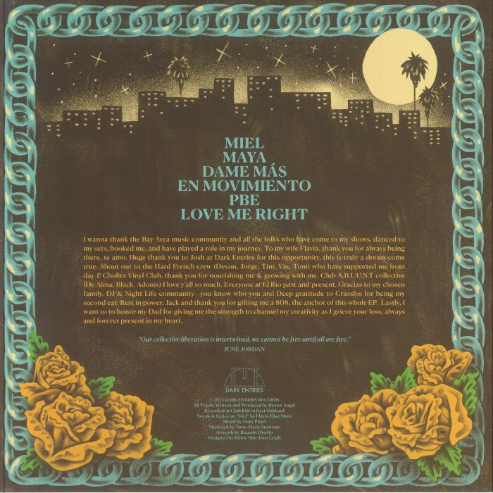 Brown Angel descends upon Dark Entries with Pure Brown Energy, an EP featuring 6 tracks of gloom-laced electro-funk and retro house. Pure Brown Energy was born when San Francisco-based producer and Hard French collective member Brown Angel was faced with a gift and a loss: an original Roland TR-808 was given to them around the same time that their father passed away. To process their grief, they set about making an album that showcased the many facets of their being, in their words: “my gay tío side, my Latin goth side, my cruising down the boulevard side, and most of all my soft vulnerable side.” From slamming vogue/ballroom house to cumbia-inflected freestyle, Pure Brown Energy channels club sounds both contemporary and timeless, while centering the most eternal electronic instrument of all: the TR-808. Opener “Miel” grooves with the effortlessness of peak-era Masters at Work or vintage Kevin Saunderson, while “Dame Más” dials up the energy even further. The influences of Miami bass and West Coast electro shine through on “Maya” and “Love Me Right,” which pair razor-sharp beats with a flurry of samples culled from Brown Angel’s record collection. “PBE” and “En Movimiento” take the Planet Rock vibes to another level, combining influences from contemporary cumbia and reggaeton sounds with Brown Angel’s Latin goth flair. Each copy comes in a sleeve designed by Ricardo Diseño featuring illustrations inspired by Teen Angels, a popular 1980’s Chicano magazine. Pure Brown Energy brings a sense of urgency to the dancefloor, unreluctantly examining the crossover between creation and loss, between celebration and sorrow. But don’t forget: these cuts also slap.