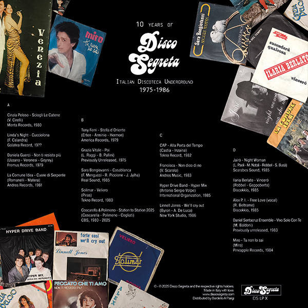 This compilation celebrates ten years of work by Disco Segreta — a decade dedicated to the research, recovery, and appreciation of Italian disco and electronic culture. An act of justice owed to all those artists who had their moment yet were never remembered by history — bringing back to light an essential, still too little known part of our musical heritage.?Because dancing today remains, more than ever, a living act of memory.