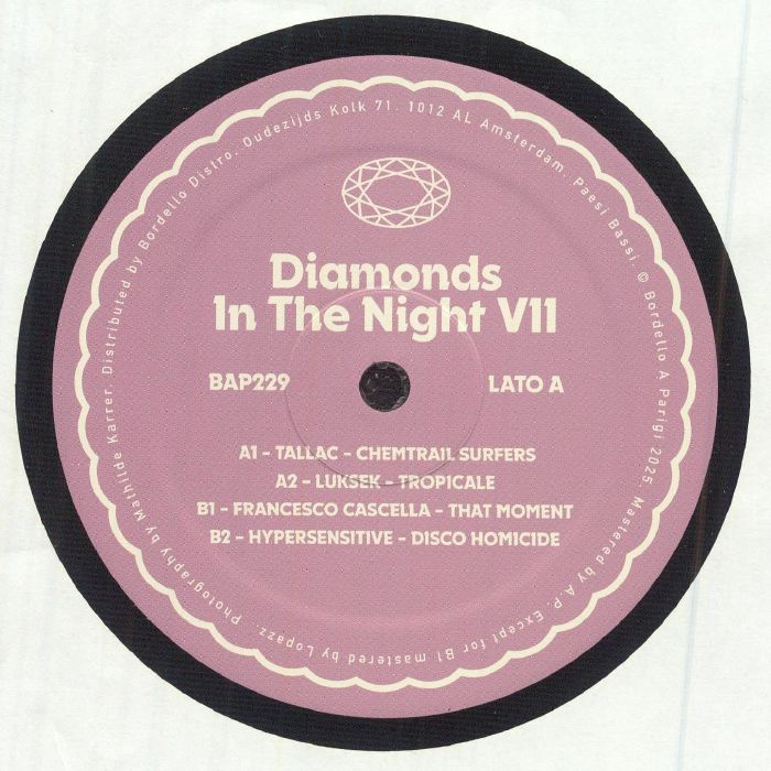 Amsterdam's Bordello a Parigi's ongoing Diamonds In The Night series has not only proved to be a reliable source of new - if authentically old sounding - Italo-disco, Hi-NRG and proto-Eurodance, but also a brilliant platform for new and up-and-coming artists. Volume seven in the series is another strong offering. It begins with the tops-off, melody-driven Hi-NRG joy of Tallac's 'Chemtrail Surfers' and concludes with the vocoder-heavy early morning dark bew wavce disco of 'Disco Homicide' by Hypersensitive. Sandwiched in between you'll find the tough, throbbing, strobe-lit and sweat-soaked hedonism of Luksek's 'Tropicale' and the Bobby Orlando and early Pet Shop Boys influenced excellence of 'That Moment' by Francesco Cascella.