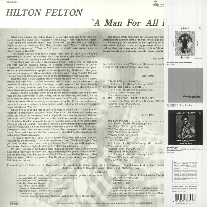 American jazz keyboardist Hilton Felton, who also recorded a superb album as The Three of Us which is also being reissued right now, dropped his most classic full length A Man For All Reasons in 1980. It came on his own label and the reason it is so well thought of is that it has become a real staple of the rare groove scene thanks to how much of it get splayed by DJs and how many key collectors have it on their racks. This reissue, with an all new remastering, arrives via P-Vine with gems like the standout jazz funk gem 'Bee Bop Boogie' one of many of its tunes that are still rare groove classics.