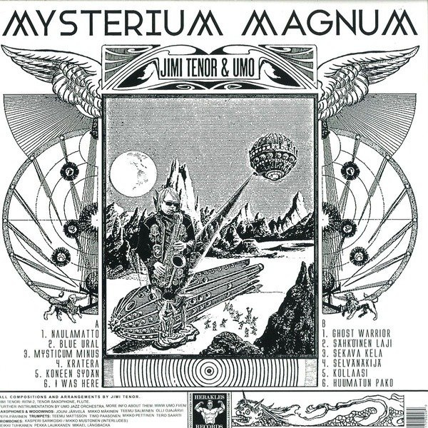 Limited Edition Vinyl LP (coloured red or white vinyl) A 1. Naulamatto , 2. Blue Ural , 3. Mysticum Magnum , 4. Kratera , 5. Koneen Sydän , 6. I was There B 1. Ghost Warrior , 2. Sähköinen Laji, 3. Sekava KEla , 4. Selvänäkijä, 5. Kollaasi , 6. Huumatun Pako Jimi Tenor has made an instrumental album “Mysterium Magnum” with the Finnish “national” Jazz Orchestra, UMO. UMO is a professional 16 piece orchestra. Specialized in jazz and contemporary rhythm music. Throughout it´s history UMO has had a focus on Finnish composers and has performed hundreds of compositions that were made especially for UMO. Jimi Tenor is a Finnish composer/performing artist maybe best known for his electronic music from the 90´s. This album is the first album that´s is composed entirely for a big band. In 2003 Jimi Tenor had his own big band and made a 6-week European tour, which included Montreux Jazz and North Sea Jazz Festivals. After 2003 Jimi Tenor has worked with an afrobeat group Kabukabu and made three albums with them: “Joystone” (2007, Sähkö), “4th Dimension” (2008, Sähkö) and “The Mystery of Aether” (2012, Kindred Spirits) In 2009 Jimi Tenor made an album with the afrobeat legend Tony Allen called “Information Inspiration” (2009, Strut) Mysterium Magnum was recorded at the rehearsal space of UMO, which is situated at the YLE studios in Helsinki. The music on “Mysterium Magnum” is not typical big band music. It varies from mystical contemporary compositions like “Koneen Sydän", “Huumatun Pako", “Mysticum Minus", “Sähköinen Laji.