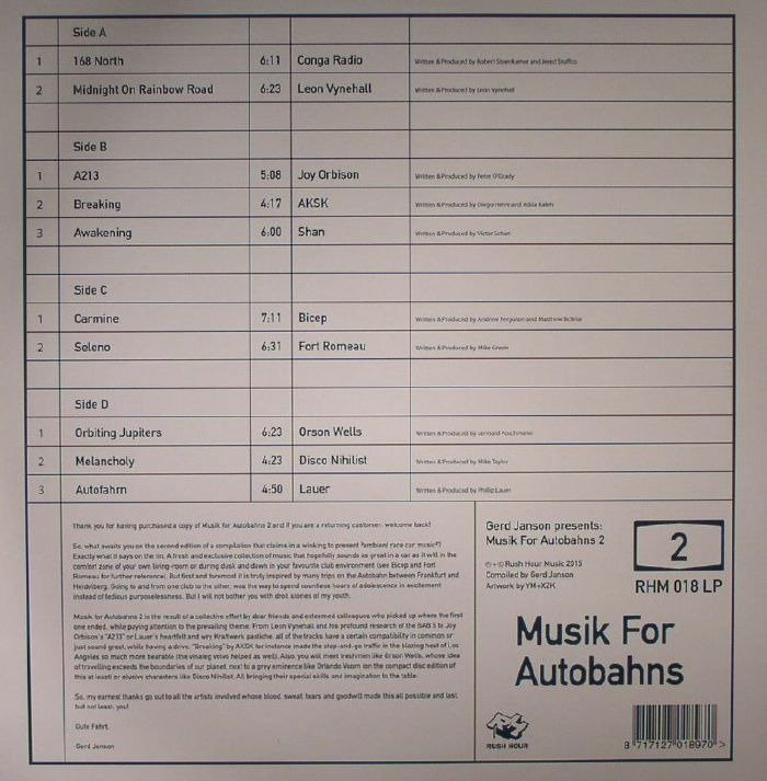For the first Musik For Autobahns compilation, released back in 2012, Gerd Janson asked some of his favourite producers to create tracks inspired by the relentless, seemingly never-ending experience of motorway driving. Three years on, he's revisited the concept with similarly pleasing results. Subtitled "ambient race car music", Musik For Autobahns 2 offers up a largely magical blend of hyponitic, Balearic-tinged downtempo grooves (see Leon Vynehall's brilliant opener), shuffling hypnotism (Joy Orbison), obligatory nods to Kraftwerk (Fort Romeau), quirky synth-pop (AKSK), Detroit influences (Disco Nihilist), trippy Balearic boogie (Conga Radio), and sublime compositions (Orlando Voorn). More importantly, it contains some wonderfully evocative and entertaining music.