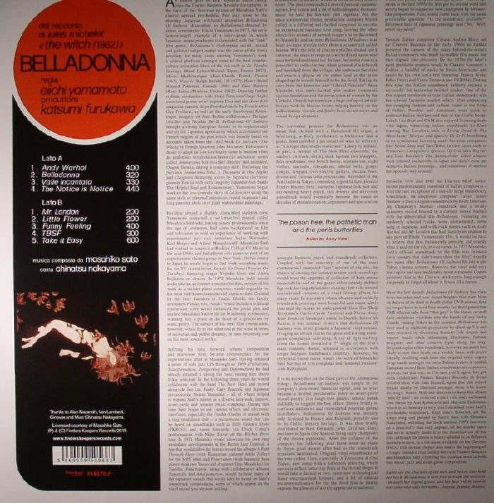 An unholy grail of near mythical status finally joins the Finders Keepers Records discography in the form of this first-ever reissue of Masahiko Sato’s elusive sensual psychedelic free jazz score to the stunning Japanese witchcraft animation Belladonna Of Sadness (Kanashimi no Belladonna) directed by anime screenwriter Eiichi Yamamoto in 1973. An early feature-length example of a micro-genre in which Japanese anime producers collaborated with the “pink” film genre, Belladonna’s challenging occult, sexual and political subject matter was the cause of the film’s notoriety for many years, earning Yamamoto’s work a critical platform amongst some of the best counterculture animation films of the era such as La Planète Sauvage ( René Laloux/Roland T poor, France 1973), Marie Mathématique (Jean-Claude Forest, France 1967), Wizards (Ralph Bakshi, US 1977), Heavy Metal (Gerald Potterton, Canada 1980) and Time Masters (René Laloux/Moebius, France 1982). Drawing further stylistic similarities with Shuji Terayama/Tenjo Sajiki associated poster artist Aquirax Uno and the Hara-Kiri magazine cartoon strips Pravda/Jodelle by French artist Guy Peellaert, as well as the early flamboyant Klimtesque imagery of Jean Rollin collaborators Philippe Druillet and Nicolas Devil, Belladonna Of Sadness brought a strong European flavour to its sophisticated and stylish Japanese application which accentuated the French origins of the plot loosely based on accounts taken from the 1862 book La Sorcière (The Witch) by French historian Jules Michelet. Over the last decade Belladonna Of Sadness has risen from the ashes and now shines brighter than ever. Now on the eve of its third or fourth global DVD release, fans no longer have to wait four months for third generation VHS telecine rubs from “that guy” in the States, or stuff their ambitious wish lists into the hands of any lucky friends visiting Tokyo in the summer. Belladonna has been used as nightclub projections by clued-up VJs and been restored by discerning feminist folk singers and improv bands while influencing illustrators, fashion designers and other creative types along the way. Original copies of the soundtrack, however, are much less likely to rear their heads on a weekly basis, with prices literally doubling each time the original stock copies swap hands amongst the same Italian dealers at central European record fairs. Italian soundtracks are expensive anyway, but this one, as I’m sure you’ll agree, has got extra credentials. Finders Keepers Records, in direct collaboration with Sato himself, agree that this record should finally be liberated amongst those who know the magic words. With our decision to keep this album “strictly Sato” we removed a track - the main orchestral love theme by Asei Kobayashi and Mayumi Tachibana, which in all honesty is very much detached from Sato’s psychedelic soundtrack. Kept intact, however, are the songs sung and penned by Sato’s then wife Chinatsu Nakayama, including the track entitled TBFS (answers on a postcard?) that only appears on the master tapes and never actually made it to the theatrical cut of the film (although the theme is briefly alluded to, in different instrumentation, in a cut-scene available on the German DVD). This reissue project also marks the beginning of a longer intended relationship between Finders Keepers and Masahiko Sato, exploring his recorded work in both film music, jazz and avant garde composition.