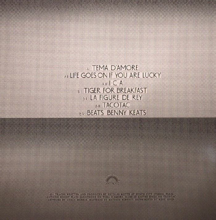 Parisian enfant terribles Antinote are back and this time present us with Nico Motte, the label's in-house graphic designer and one half of graphic design entity Check Morris. Following up 2014's Rhelogia EP, Motte serves up a brilliantly eclectic album exploring the Balearic, cosmic and downbeat across this fascinating journey. Starting out with the "Tema D'Amore" which sounds like something early 80's film soundtrack that was rescued for the cutting room floor, there's also the vintage Chicago house vibes of "ICA", the sombre and breathtaking ambience of "Tiger For Breakfast" and the sultry minimal disco of "Tacotac" among others. Music for modern lovers, young poets and the artists.