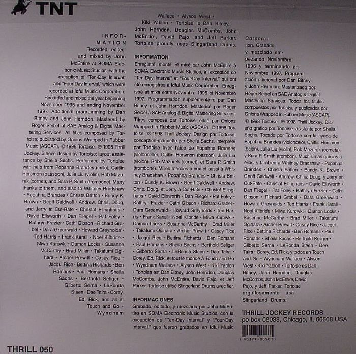 Thrill Jockey 20th Anniversary LP repress / 1998 : Tortoise's third studio album TNT is released. In and out of print over the past decade we are happy to finally give everyone what they have been asking for - TNT on vinyl again! Pressed on high quality virgin vinyl, the two LPs are packaged in a deluxe old-style tip-on gatefold jacket fully replicating the original artwork and includes a download coupon for the first time! Tortoise's third full-length release, TNT, was written and recorded during a 10-month interval in 1997. This longer-than-usual writing/production schedule was purposefully undertaken by the group in the hopes of crafting an expansive, diverse, yet thematically coherent offering. TNT builds upon the spare, instrumental framework of the group's first, self-titled album, and the extended edits, melodic adventures, and klangfarben of the subsequent full-length release, Millions Now Living Will Never Die. Further to this, Tortoise's interest in the possibilities offered by the remixing of tracks was realized within the actual production of TNT, individual elements, sections, or sometimes whole compositions mutate within the album's shifting framework. These techniques were suitably realized thanks in part to the use of non-linear digital recording and editing methods, the first example of such work for the group.